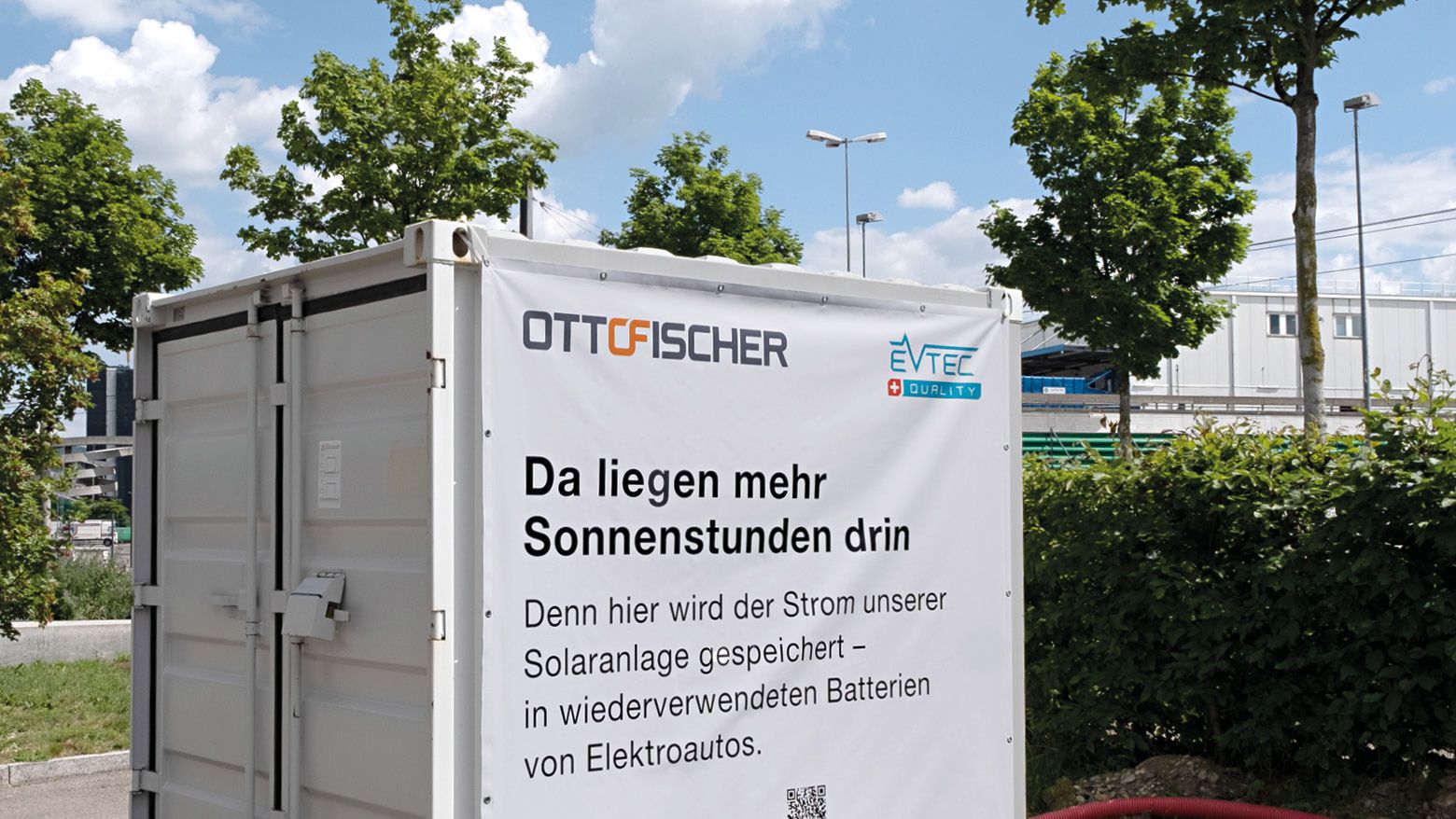 Afin de capturer les pics de charge en cas de production irrégulière de courant solaire ou pour optimiser la consommation propre, il est possible d’utiliser des accumulateurs à batterie. Des batteries usagées de véhicules électriques peuvent aussi être utilisées pour cela. Dans l’entreprise Otto Fischer, nous testons actuellement un de ces accumulateurs «Second Life». Ce cube de puissance compact se trouve désormais sur une petite partie des places de parking pour visiteurs devant notre siège principal.