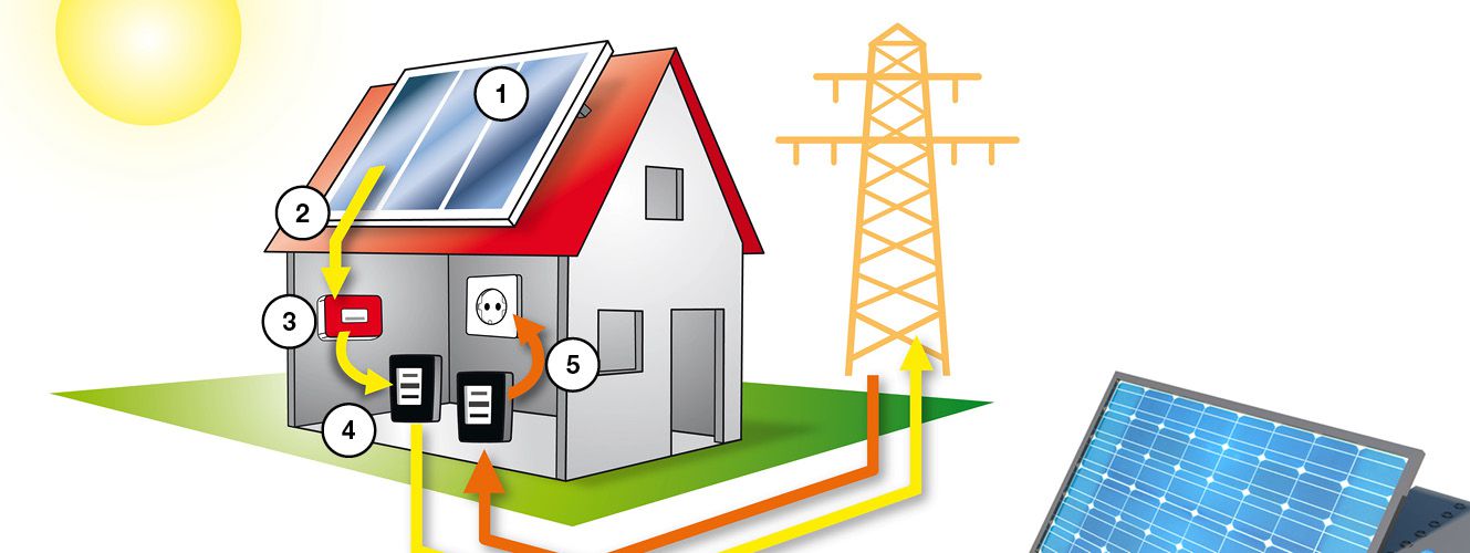 L’altra tipologia di impiantistica è quella degli impianti collegati alla rete pubblica di distribuzione elettrica. Le celle fotovoltaiche trasformano l’energia dell’irraggiamento solare in corrente continua. La corrente continua prodotta viene inviata all’invertitore, dove viene trasformata in corrente alternata, così da poter essere compatibile con la rete pubblica. La corrente alternata passa poi attraverso un contatore che misura visibilmente la quantità di energia elettrica prodotta. Se nei giorni soleggiati l’impianto produce più corrente di quanta se ne consumi, il surplus energetico viene immesso nella rete pubblica (= immissione di energia nella rete). Spesso, invece nei giorni in cui c’è brutto tempo oppure di sera, si consuma più corrente di quanta ne riesca a produrre l’impianto fotovoltaico. In questo caso, la quantità mancante di corrente passa dalla rete alla casa (= prelievo di energia dalla rete). L’impiego di sistemi di accumulatori a batteria e di gestione dell’energia consente tuttavia di incrementare notevolmente l’autoconsumo di energia elettrica prodotta dall’impianto.